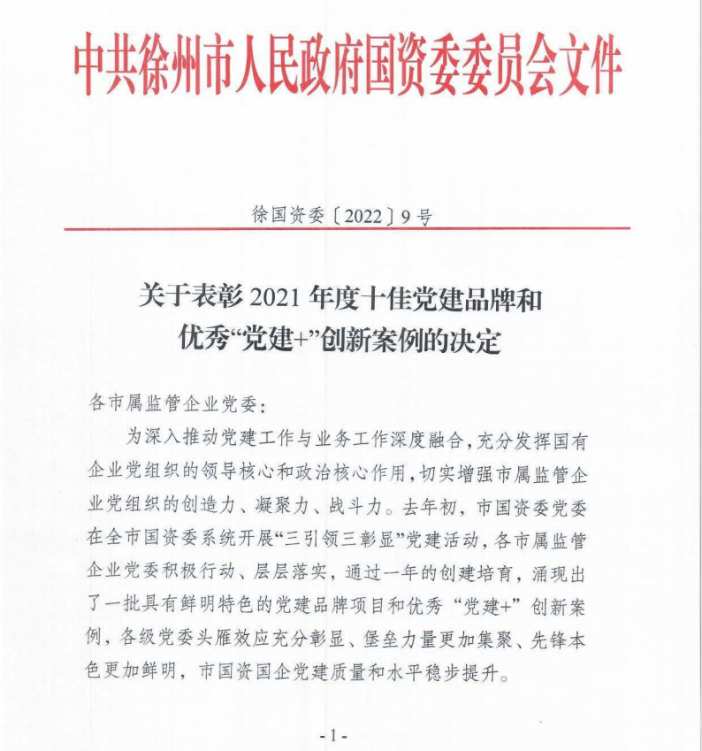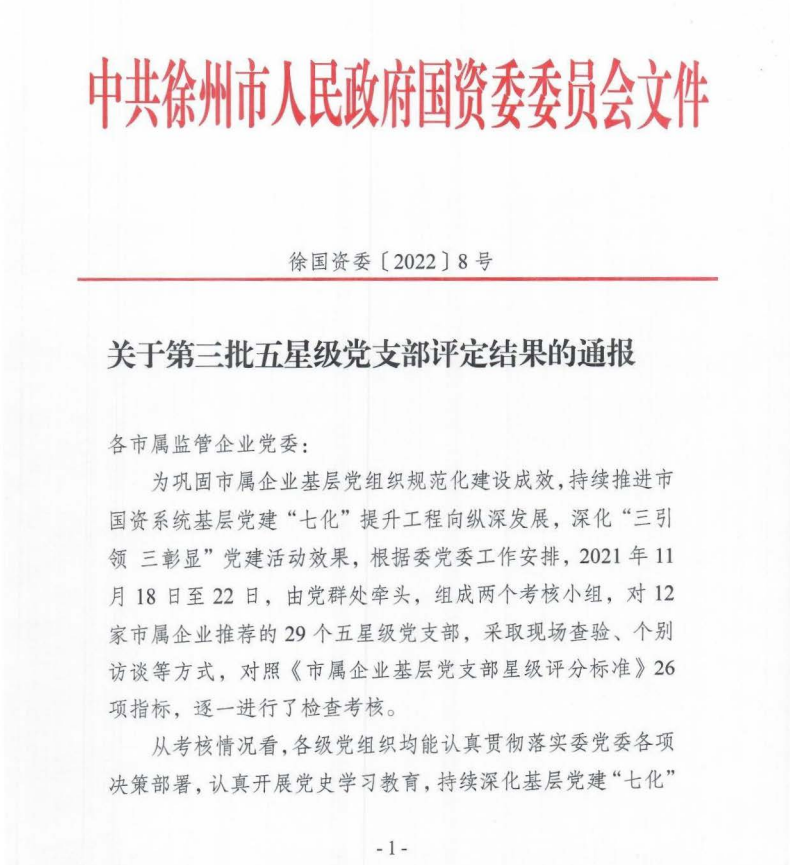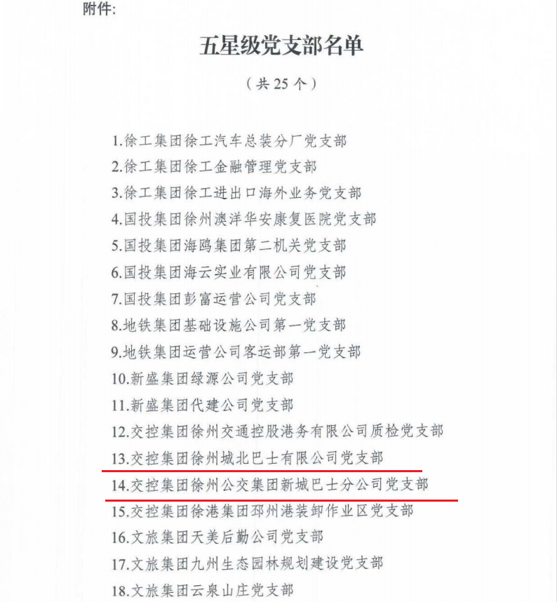 市國資委黨委還下發(fā)了《關(guān)于第三批五星級(jí)黨支部評(píng)定結(jié)果的通報(bào)》,其中徐州公交城北巴士公司黨支部、新城巴士公司黨支部被命名為“五星級(jí)黨支部”。