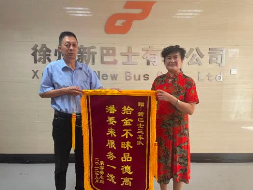 9月5日上午,市民楊女士專(zhuān)程來(lái)到徐州公交新巴士公司送上一面印有“拾金不昧品德高,潘要來(lái)服務(wù)一流”的錦旗,感謝徐州新巴士公司8路線駕駛員潘要來(lái)。