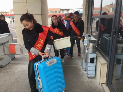 ?xml:namespace>。志愿者們身披綬帶深入各大站點(diǎn)、車場(chǎng),開(kāi)展站臺(tái)咨詢,導(dǎo)乘服務(wù),主動(dòng)扶老攜幼,為乘客兌換零錢(qián),共發(fā)放乘車指南1000余份,深受乘客歡迎。圖為賈汪公司志愿者在幫助江蘇安全技術(shù)職業(yè)學(xué)院開(kāi)學(xué)返校的學(xué)生運(yùn)送行李。