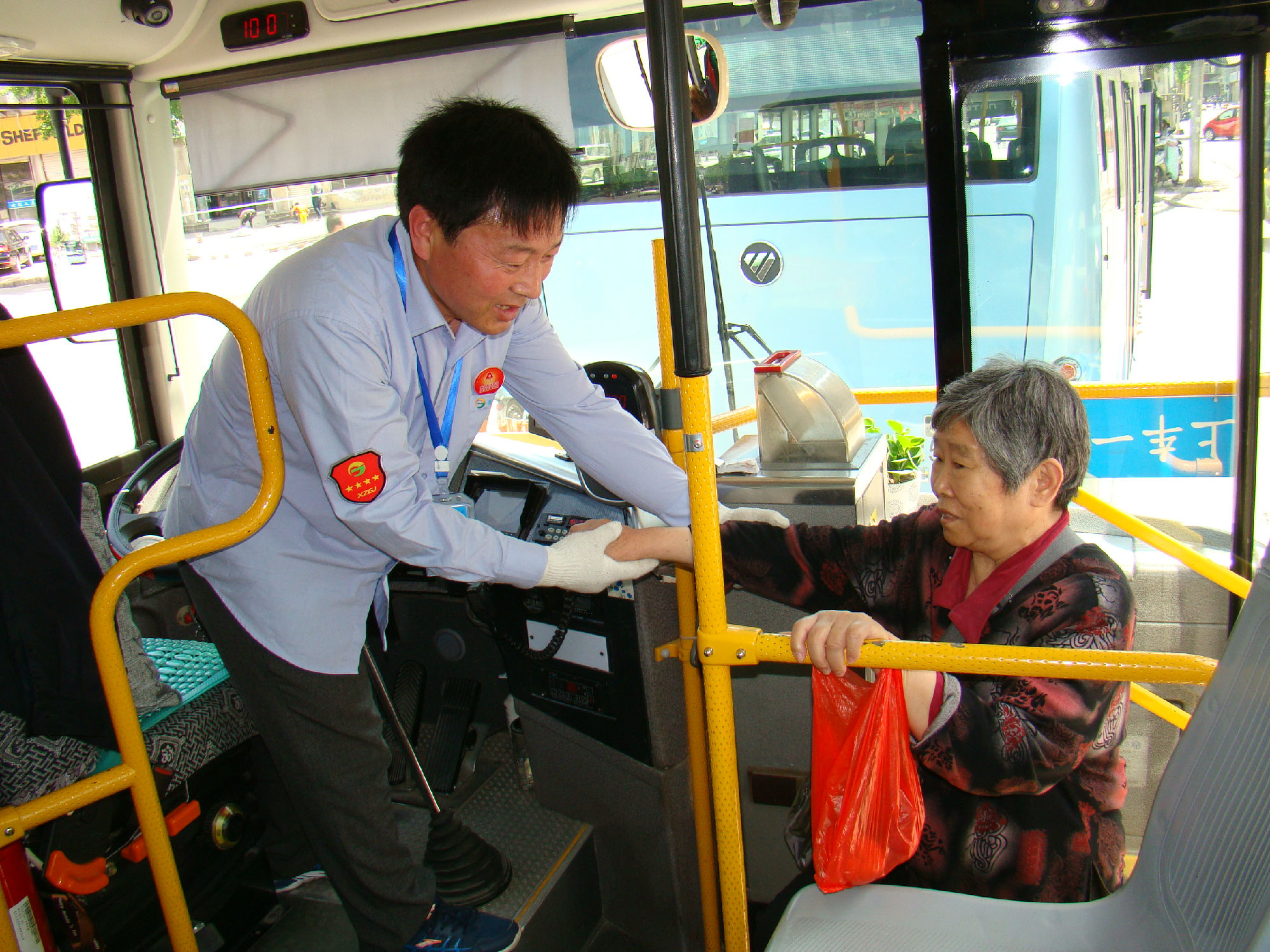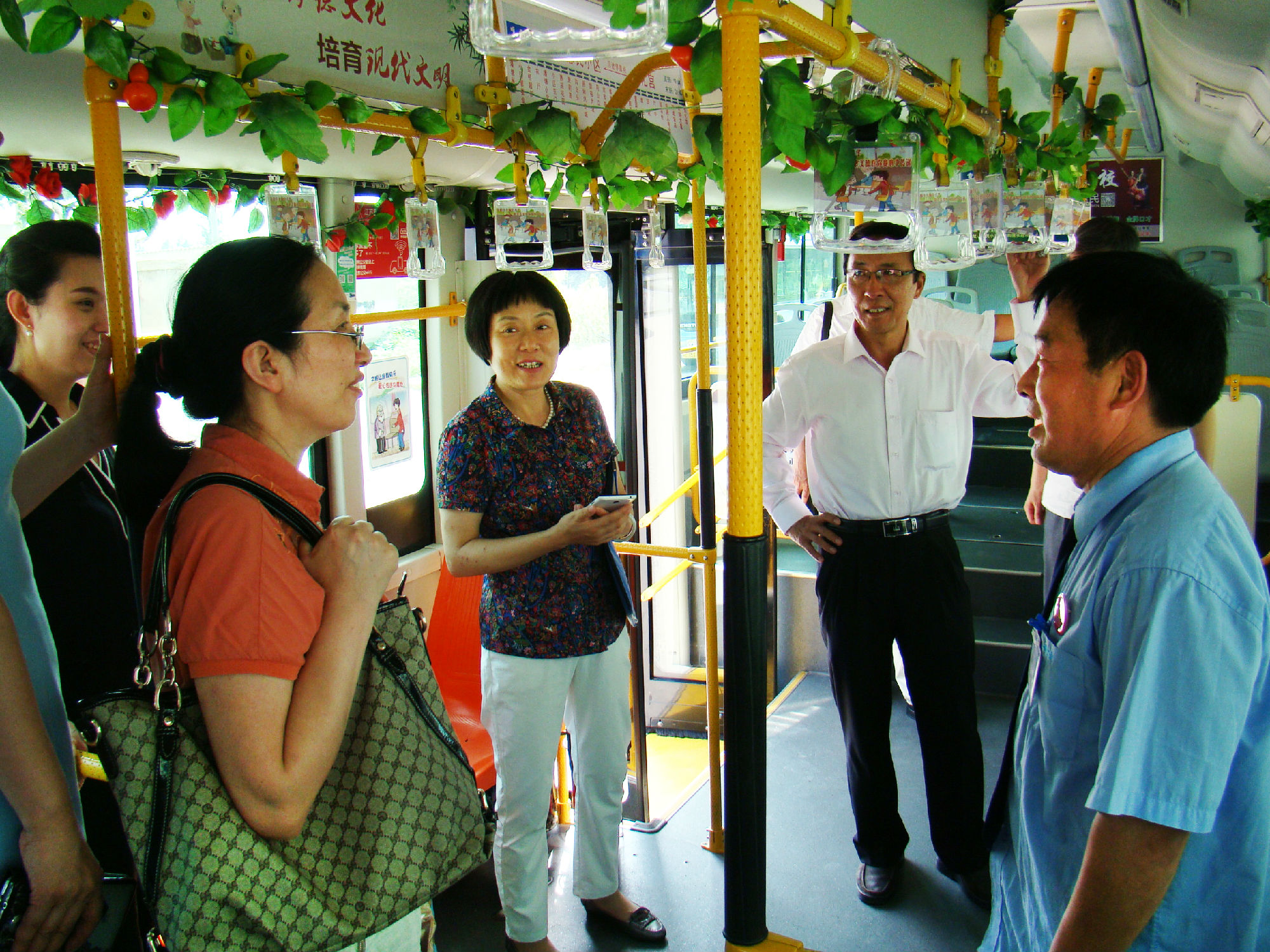 為有效提高老年人乘車安全系數(shù),公司為14路線在車廂內(nèi)設(shè)置“老幼病殘?jiān)小睈?ài)心專座的基礎(chǔ)上,專門設(shè)置了“敬老專座”; 為了給老年乘客提供優(yōu)美的乘車環(huán)境,還在車廂的頂部和前部放置各種綠色植物和鮮花,同時(shí),在駕駛座后面安裝了便民袋,配備常用藥物、老花鏡、針線包、意見(jiàn)簿及公交乘車指南、報(bào)紙、老年人專用雨披等物,讓老年乘客登上公交車,就能感受到清新氣息。