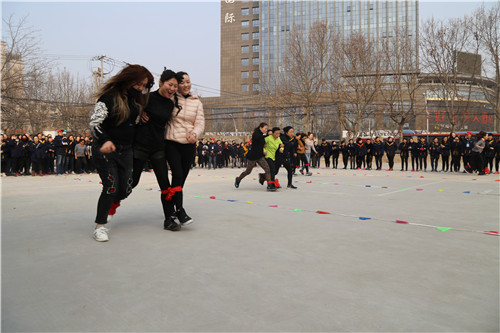 “參賽隊(duì)員各就各位!裁判員準(zhǔn)備計(jì)時(shí)!”運(yùn)動(dòng)會(huì)主持人一聲令下,首先開(kāi)始比拼的項(xiàng)目是需要隊(duì)員齊心協(xié)力,發(fā)揚(yáng)合作精神的“三人四足接力賽”,三人一組紅繩綁腿齊步走,每隊(duì)12名參賽隊(duì)員,比的是速度,更是勁兒往一處使的同心合力?!凹佑?!加油??!”“一二!一二!”比賽場(chǎng)上運(yùn)動(dòng)員的號(hào)子聲和場(chǎng)外女工們的加油聲、歡笑聲交織一起,此起彼伏。