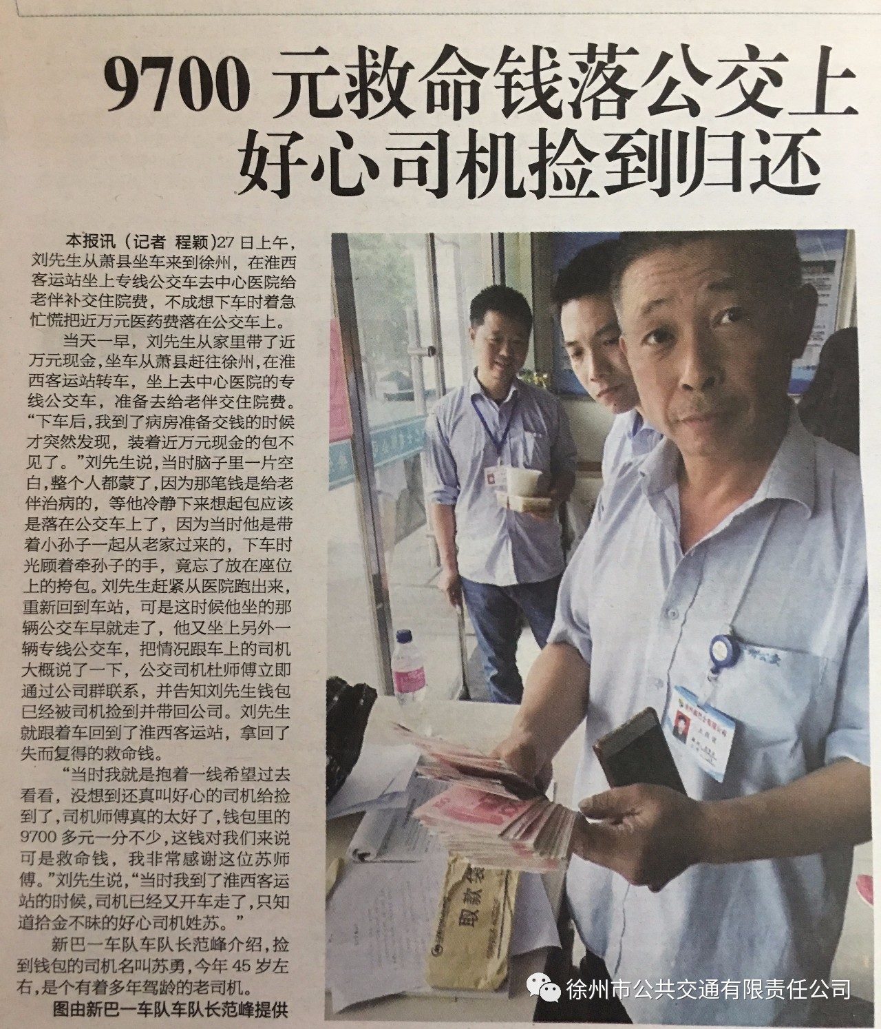 車隊(duì)管理人員打開包尋找乘客的聯(lián)系方式,發(fā)現(xiàn)包里有一個(gè)信封,信封里面裝著9700元現(xiàn)金,便立即將包妥善保管。不久,失主劉先生來(lái)到調(diào)度室尋找,看到失而復(fù)得的包裹十分激動(dòng),他說(shuō):“我抱著一線希望來(lái)這兒看看,沒(méi)想到還真叫好心的司機(jī)給撿到了,9700元一分不少。這錢對(duì)我們來(lái)說(shuō)是救命錢,今早到醫(yī)院給老伴補(bǔ)交住院費(fèi)的,我非常感謝蘇師傅”。