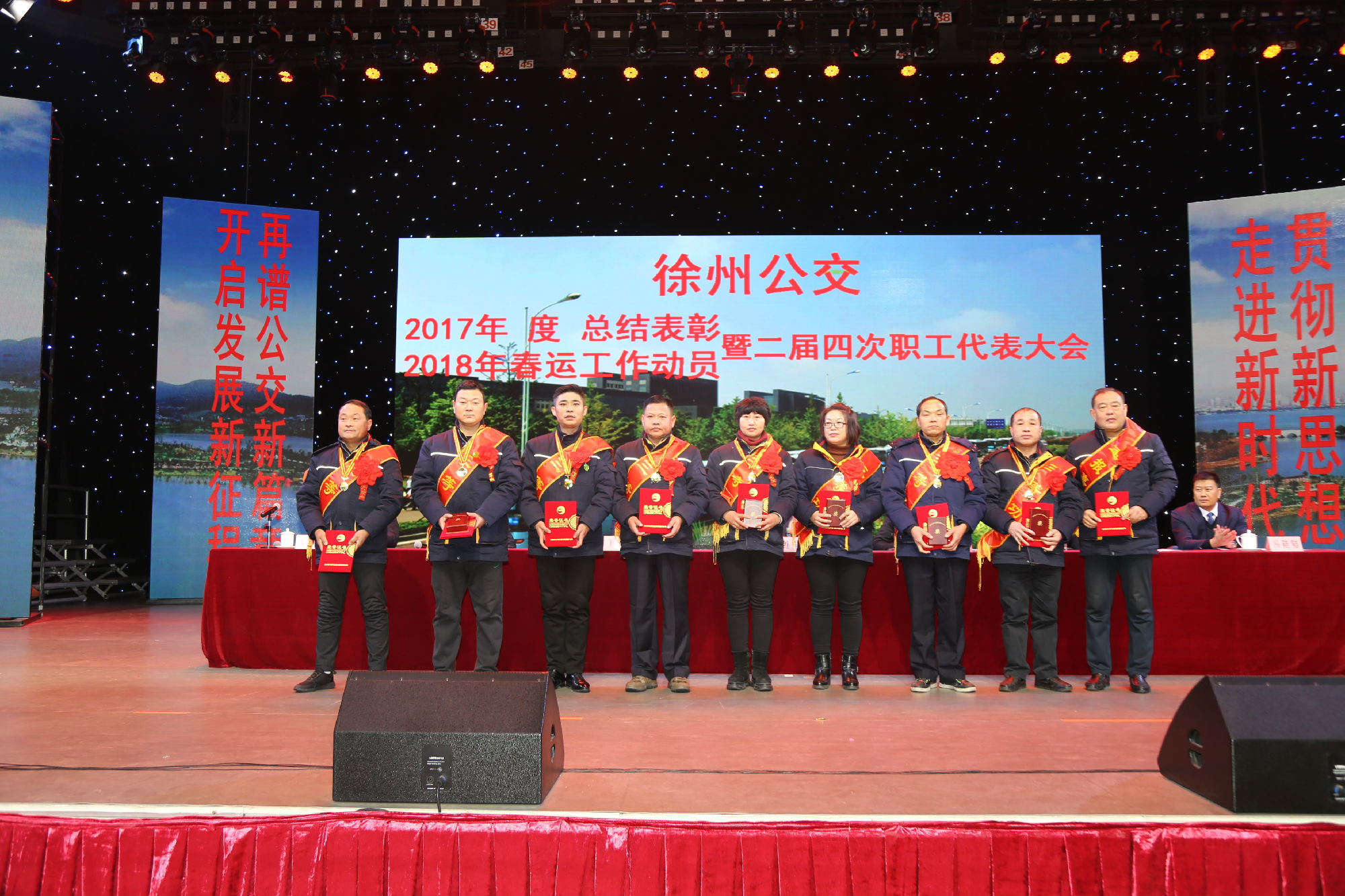 大會在莊嚴的國歌聲中拉開序幕。公司董事長、總經(jīng)理杜紅軍首先作經(jīng)理工作報告,對2017年“改革創(chuàng)新年”工作進行了全面總結(jié):一、實施“同城同價”,優(yōu)化運營管理,實現(xiàn)服務(wù)水平新突破。連續(xù)第五年面向全市征集線路線網(wǎng)優(yōu)化意見近3000條,據(jù)此新辟優(yōu)化線路29條。二、深化資源共享,在互聯(lián)網(wǎng)+企業(yè)管理上譜寫新藍圖。繼續(xù)深化集中維修,推行集中例檢。論證實施支付寶、微信、銀行卡閃付等智能化移動支付方式。三、深化文明創(chuàng)建,打造優(yōu)秀公交,服務(wù)民生出行贏得新口碑。在國檢、省檢中未失一分,圓滿完成創(chuàng)建驗收任務(wù)。投訴總數(shù)和有責投訴同比實現(xiàn)“雙下降”。乘客表揚同比上升近20%。公司在2016年行風熱線上線單位滿意度評議投票中名列榜首。率先打造公交行業(yè)禮讓斑馬線嶄新形象,圓滿完成公交反恐防暴工作。四、著力綜合管理,聚合內(nèi)生動能,增強企業(yè)發(fā)展新優(yōu)勢。重新修訂2012版管理制度匯編和新版《徐州公交獎懲條例》。五、踐行十九大精神,推進和諧發(fā)展,開創(chuàng)黨群工作新面貌。接著,杜總分析了工作中存在的問題,提出下步工作重點。一、建設(shè)現(xiàn)代化公交,提升經(jīng)營管理水平,保障企業(yè)良性有序運行;二、踐行集約共享理念,深化科技應(yīng)用,開創(chuàng)公交事業(yè)發(fā)展新局面;三、建設(shè)平安公交,提升服務(wù)口碑,展示文明公交新形象;四、踐行十九大精神,構(gòu)建和諧公交,開啟黨群工作新面貌。